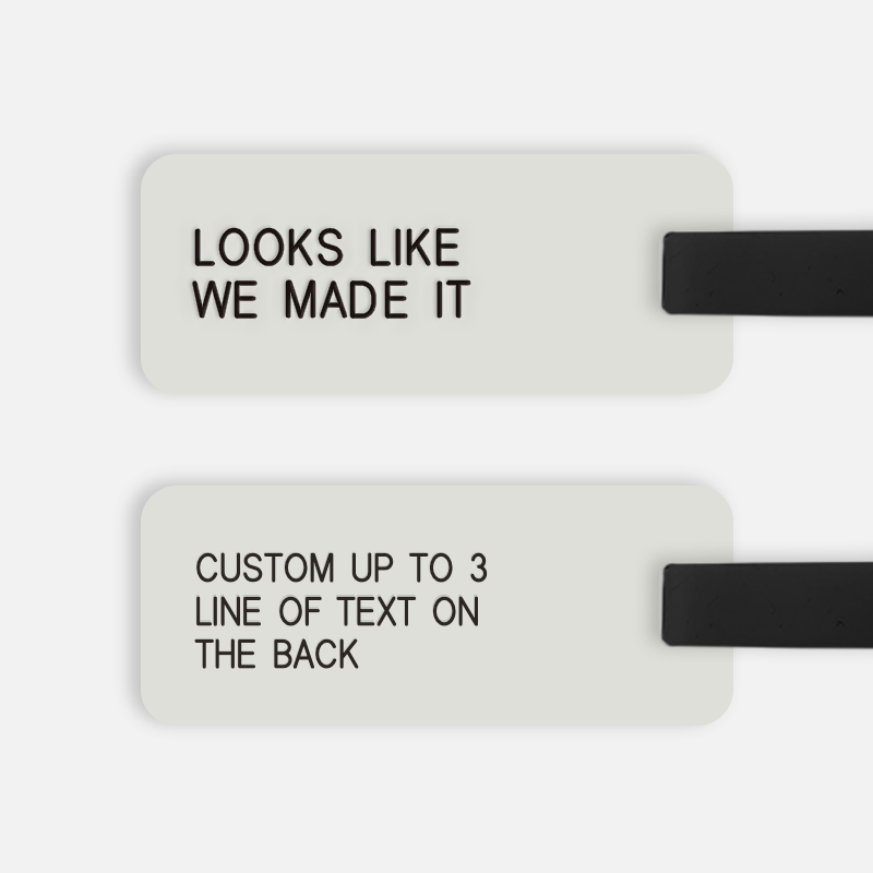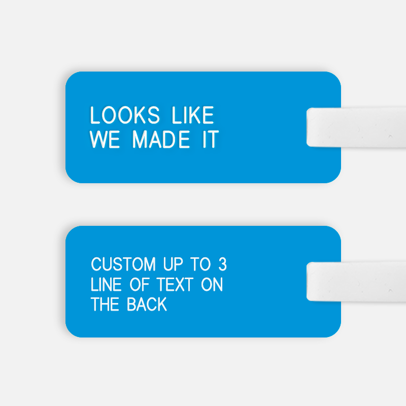 Various Luggage Tags are custom engraved for design-minded people who enjoy travel, happiness, and fun. Born out of a deep love of travel and the sheer necessity of finding a simple Luggage Tag that isn’t too fussy. Whether your next International trip, or a well-deserved Staycation, Various Luggage Tags will help you keep track of your bags with ease and aplomb. Each engraved Tag comes with our specially designed strong and supple silicone strap. There are instructions on securing the strap within the packaging, or if you prefer a quick video... you can refer to our new instructions page! Choose from a wide variety of surface color / finish and text color combinations (the back surface matches the color of the front surface), 3 sizes of our custom font (small for up to 3 lines of text, medium for up to 2 lines of text, large for 1 line of text) and alignment (left, center, right). "LOOKS LIKE WE MADE IT" engraved text on one side and your custom engraved text on the other side.